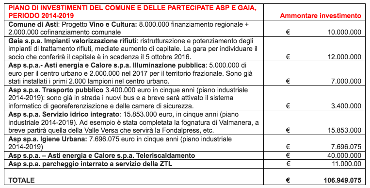 Condivido e raccolgo la proposta dei sindacati di riattivare il “Tavolo dello sviluppo”, con alcuni aggiustamenti per rimediare ai problemi che avevano portato il tavolo a “spegnersi”: le cronache dell’ultima riunione del 17 febbraio 2015 parlano di “mancanza di entusiasmo” e “perplessità sull’utilità di uno strumento che nel passato ha fallito il decollo” sollevate dagli stessi partecipanti alla seduta. Per evitare divagazioni propongo di iniziare con riunioni mirate su progetti specifici e concreti, per poi inserirli in una strategia da costruire insieme. Gli investimenti. I sindacati hanno sottolineato il problema della carenza di investimenti ricordando che “le poche risorse sono legate al Progetto vino e cultura” del Comune di Asti. Poiché concordo sul fatto che gli investimenti sono fondamentali per la crescita, vorrei sottoporre per prima cosa al Tavolo i piani di investimento del Comune e delle sue partecipate (ASP e GAIA) che sanno attivando investimenti che entro il 2019 supereranno i cento milioni di euro: molto di più di quanto stia facendo qualunque soggetto privato. I servizi. I nostri investimenti si concentrano nei servizi e ricordo che di recente Tito Boeri, il presidente nazionale dell’Inps, nonché professore di Economia alla Bocconi, ha dichiarato che “il futuro occupazionale risiede soprattutto nel settore dei servizi dove è più alto il capitale umano a disposizione”. I cento milioni servono infatti per il turismo (10 milioni per Vino e Cultura), ristrutturare e potenziare gli impianti di valorizzazione dei rifiuti (12 milioni di euro di aumento di capitale di Gaia); per l’illuminazione pubblica (7 milioni di euro tra centro urbano e frazioni); il trasporto pubblico (3.400.000 euro); riorganizzare il servizio di igiene urbana (quasi 8 milioni di euro); acquedotti e fognature (quasi 16 milioni di euro) e, se ce li lasceranno fare, teleriscaldamento (40 milioni di euro) e parcheggio interrato (11 milioni di euro). E’ bene che il Tavolo di sviluppo si esprima per capire se questi investimenti interessano la Città e per suggerire come eventualmente migliorare i progetti: siamo disponibili anche a cambiare i progetti se serve per coinvolgere maggiormente gli operatori astigiani. La convocazione. Sentirò alcuni degli altri Enti per indivisuare una data tra il 3 e il 9 ottobre in cui convocare la prima riunione del Tavolo sul tema dei servizi: al termine della riunione si potrà concordare un nuovo argomento da affrontare insieme e fissare una nuova seduta. Fabrizio Brignolo sindaco di Asti
